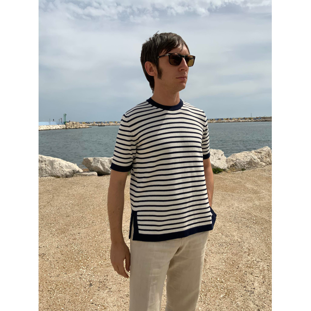 Made in Italy from pure cotton by Manifatture Tessili Bresciane (7 gauge), it boasts refined contrast piping along the neck, sleeves, and hem.